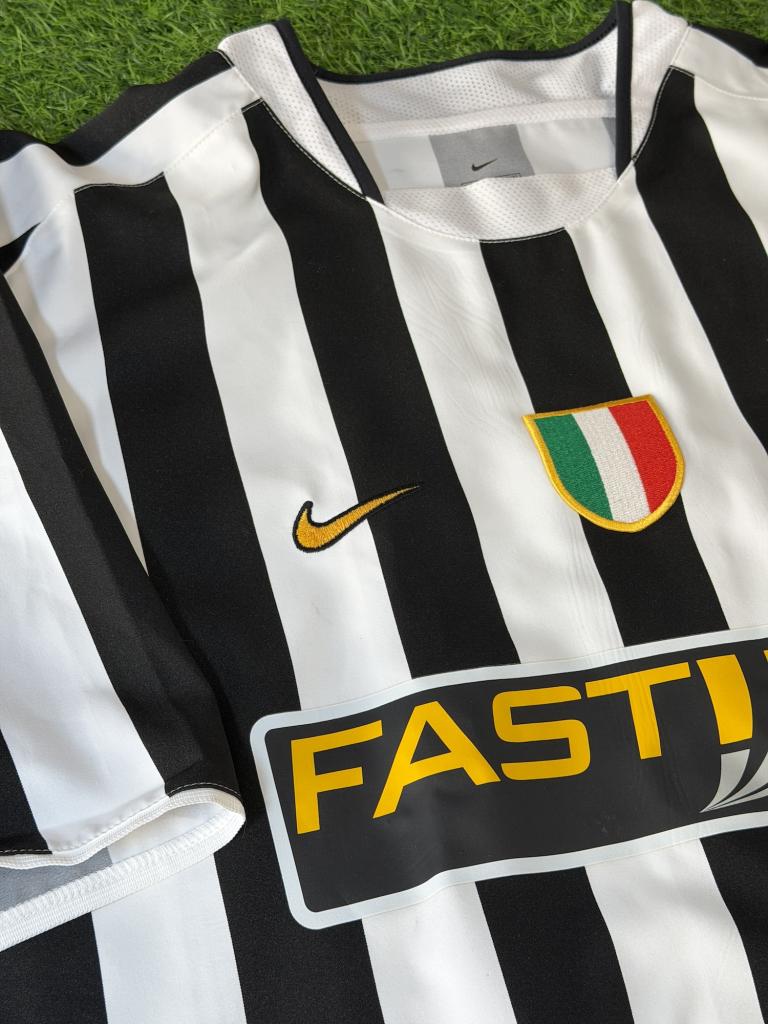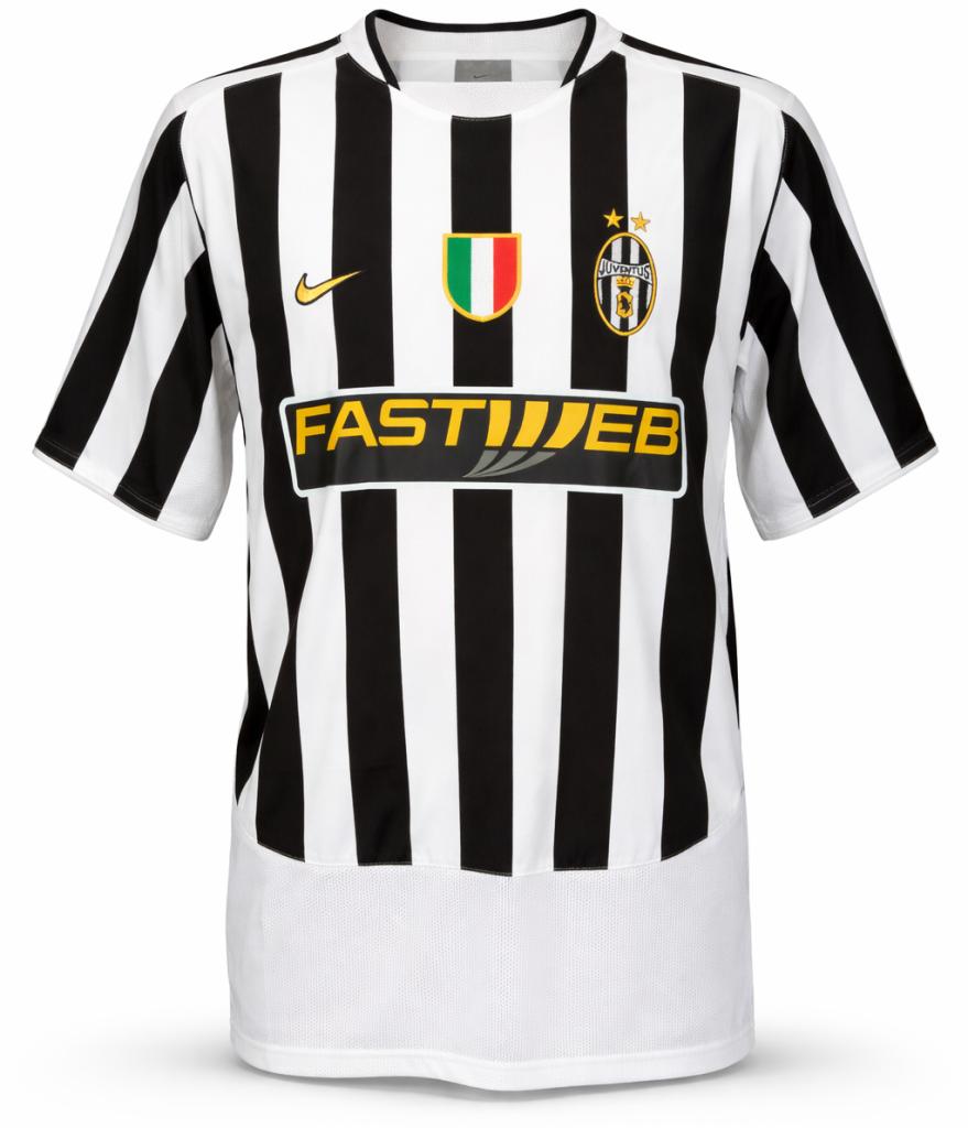 Autografo di Alessandro Del Piero su maglia Juventus Home stagione 2003/04 versione Store, realizzata da Nike con classico design a strisce verticali bianconere e sponsor commerciale Fastweb al centro del petto.