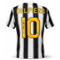 La maglia presenta Scudetto tricolore e dettagli giallo oro, con personalizzazione ufficiale DEL PIERO 10 sul retro. L'autografo è presente sul numero 0, rendendo il pezzo particolarmente interessante per il collezionismo legato a uno dei simboli del club.