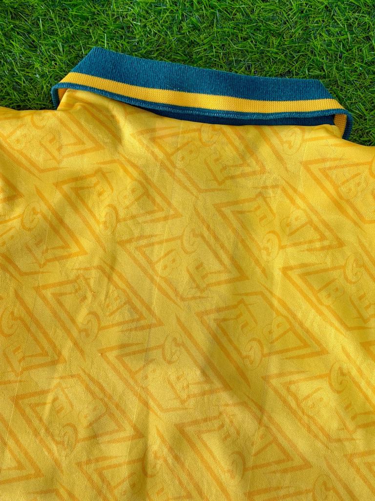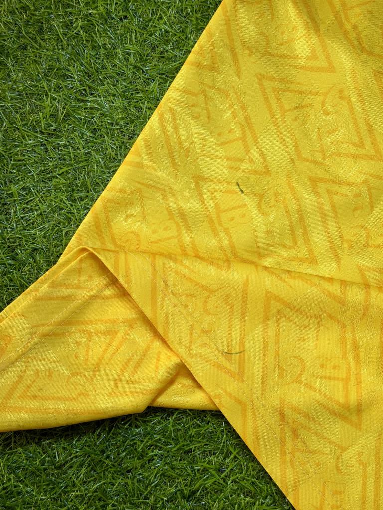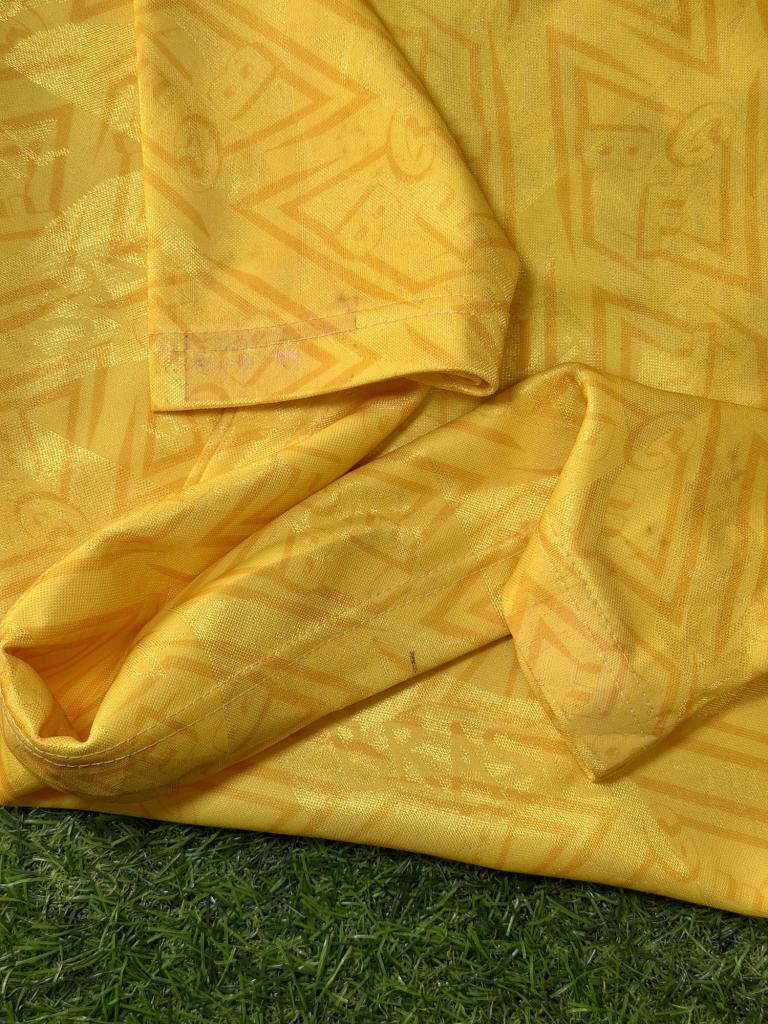 Autografo di Ronaldo Luís Nazário de Lima su maglia Brasile Home 1992/93 versione Replica, realizzata da Umbro con iconico design giallo arricchito da pattern geometrico tono su tono e dettagli verdi su colletto e rifiniture.
