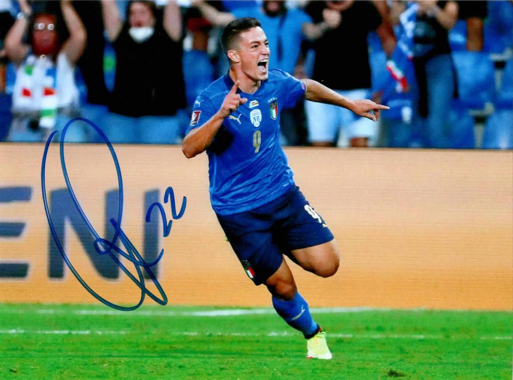 Fotografia a colori con firma autografa di Giacomo Raspadori, calciatore.