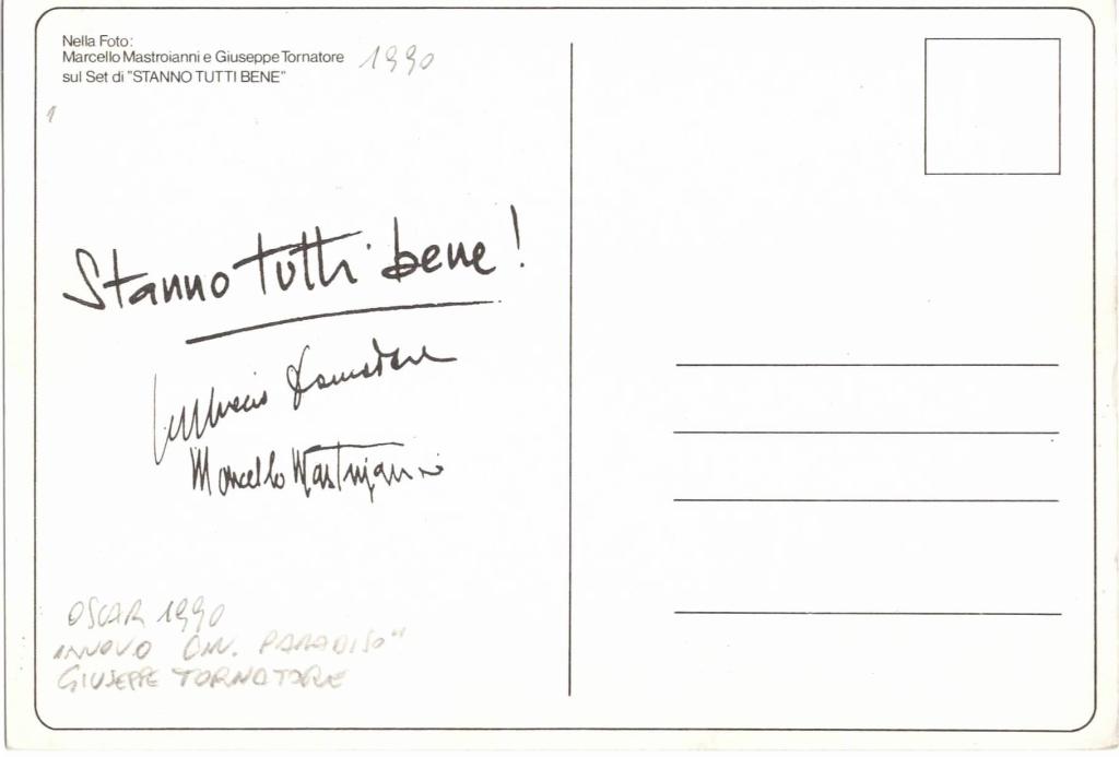 Sul retro sono riportate le firme a stampa di Tornatore e Mastroianni.