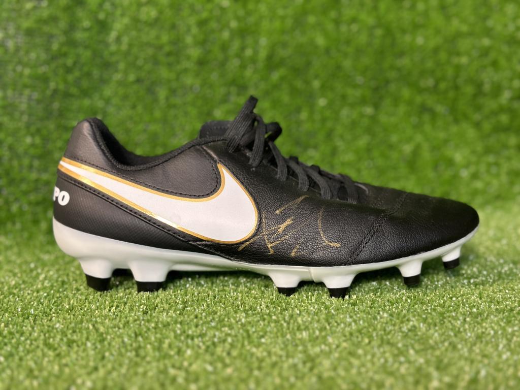 Autografo apposto su scarpa originale Nike Tiempo e redatto con pennarello oro.
