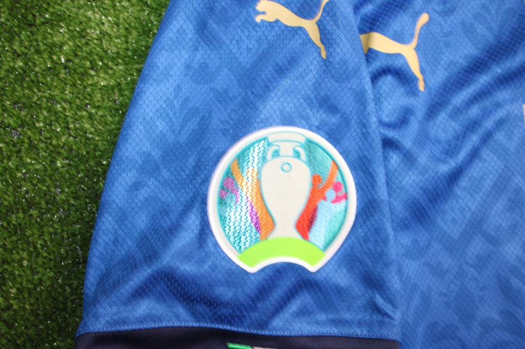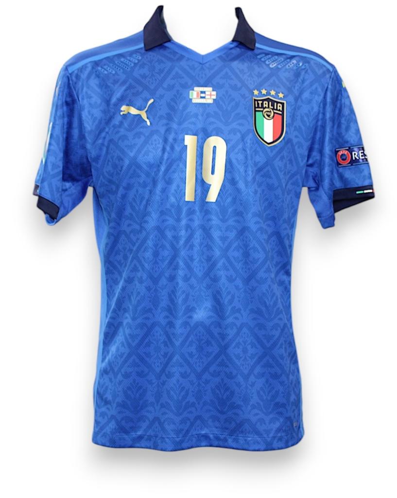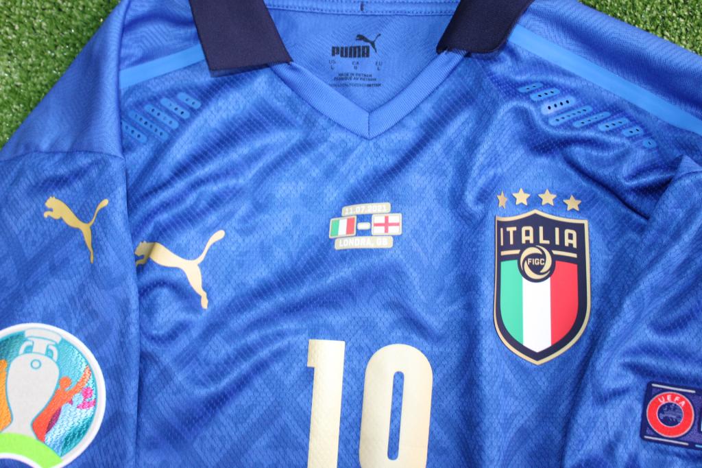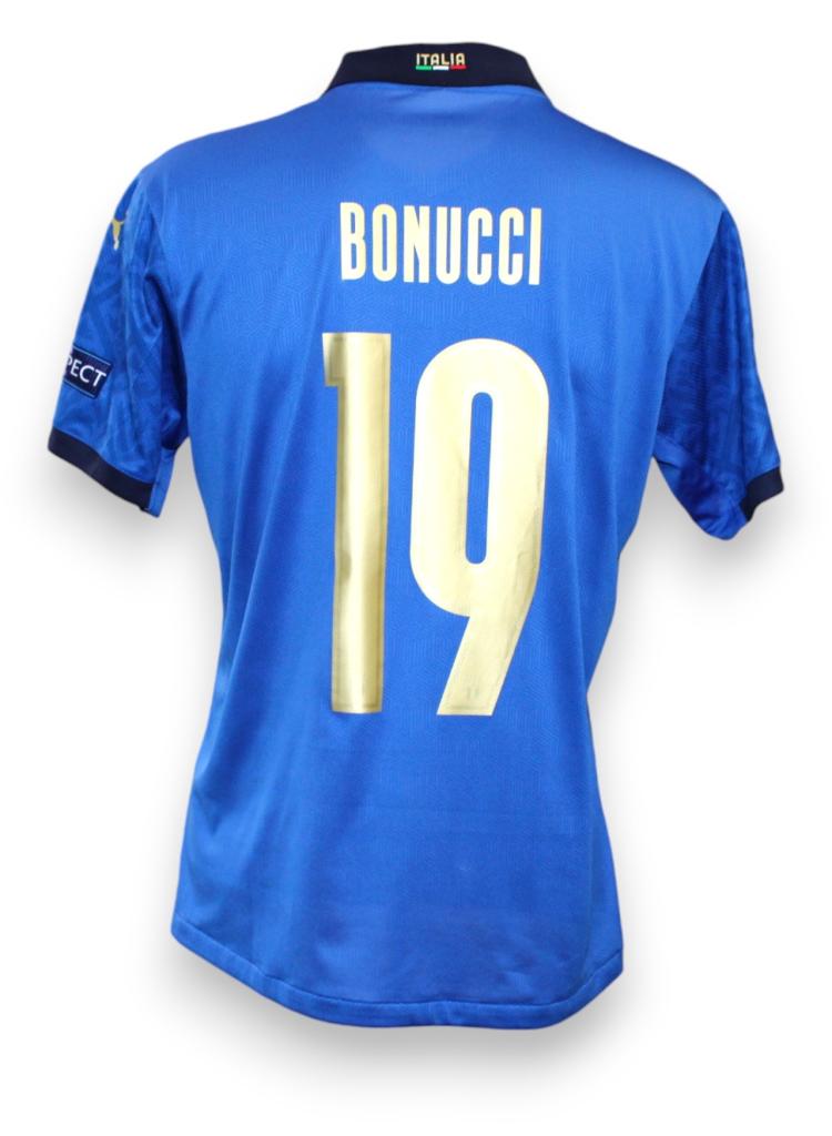Maglia Italia versione Player Issued preparata per il calciatore Leonardo Bonucci per la finale Euro 2020 a Londra disputata contro l'Inghilterra l'11-07-2021. L'Italia di Mancini e Vialli vinse ai rigori conquistando il titolo di Euro 2020.