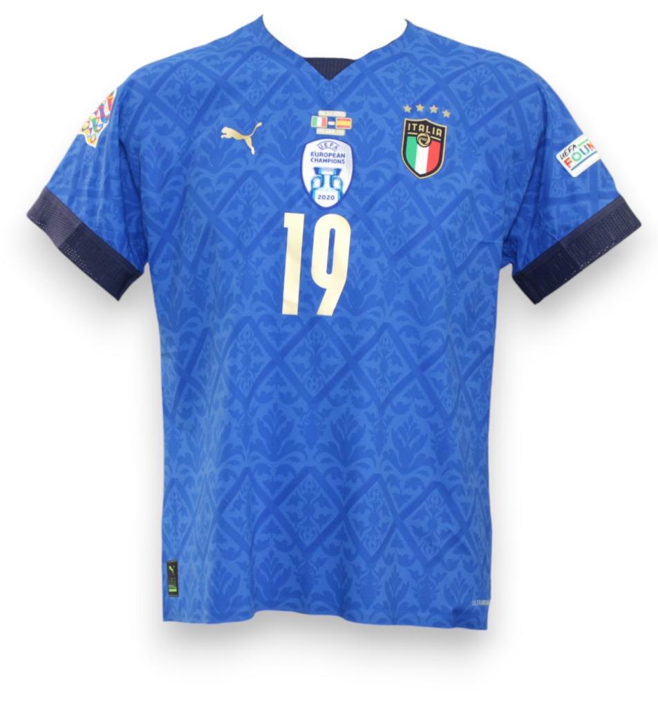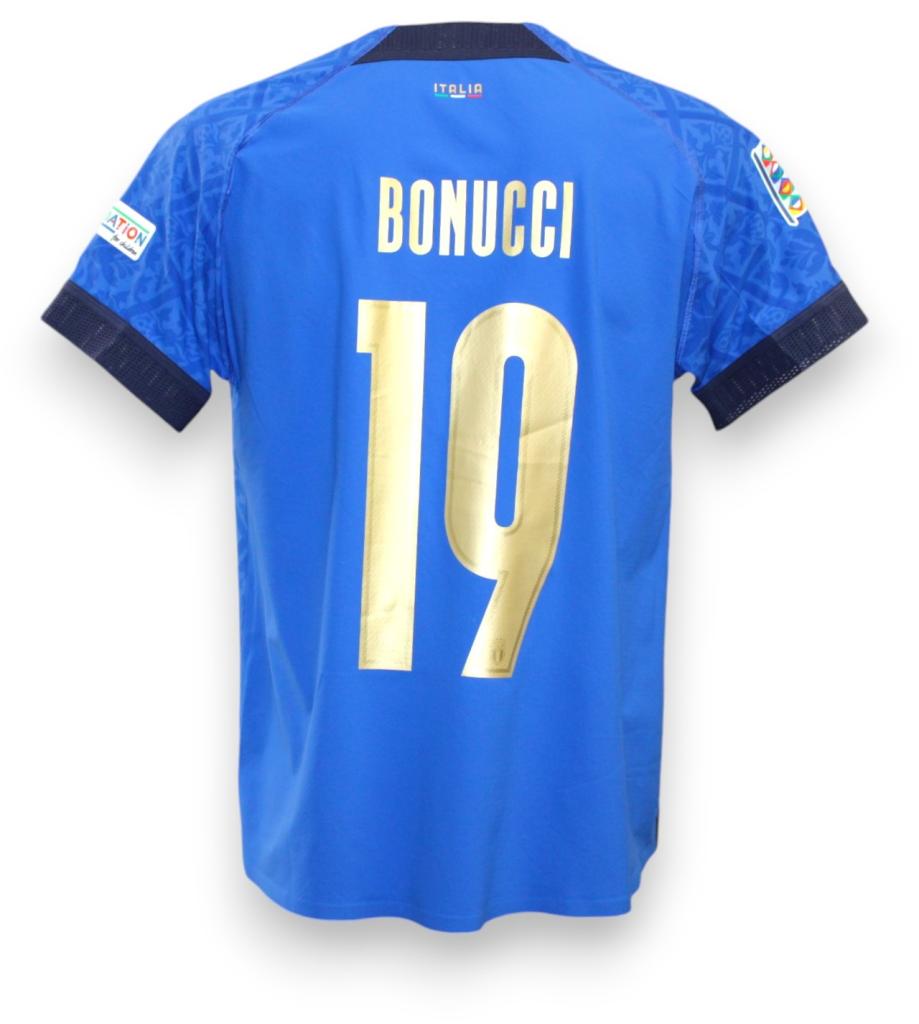 Maglia Italia versione Home Player Issued preparata per il calciatore Leonardo Bonucci per la Nations League a Milano disputata contro la Spagna il 6-10-2021.