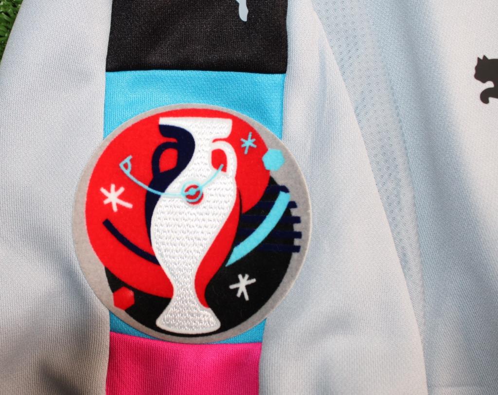 Maglia grigia Goalkeeper a maniche corte, prodotta da Puma che riporta lo stemma dell'Italia applicato sul petto, la patch "UEFA Euro Qualifiers" applicata su manica destra e il nome e numero "12" applicati in plastica sottile.