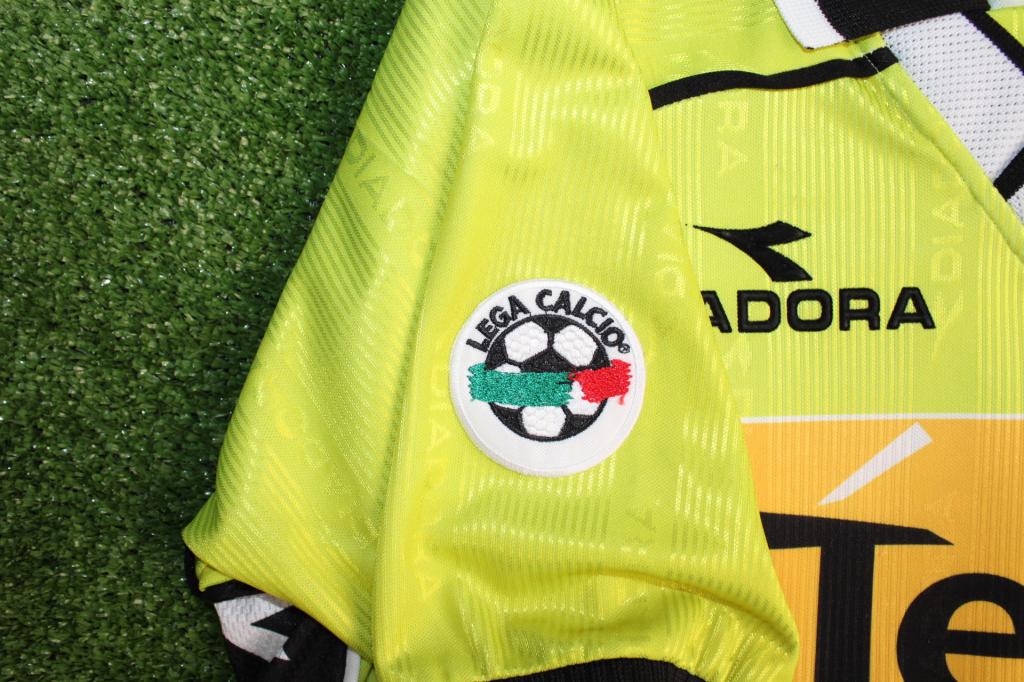 Maglia con trama prodotta da Diadora. Presente sulla manica la patch della Lega Calcio Serie A.