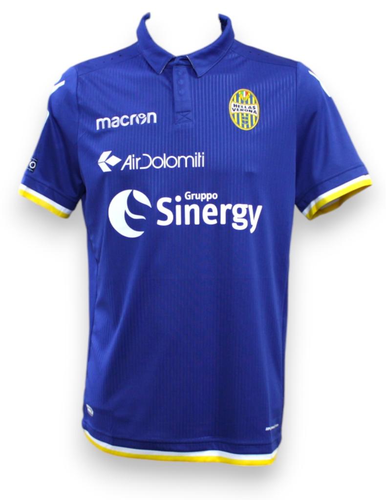 La maglia dell'Hellas Verona 2018-19 è di colore blu con colletto a polo e dettagli gialli nel fondo maglia e nei bordi delle maniche. La parte anteriore della maglia presenta un sottile disegno a righe.