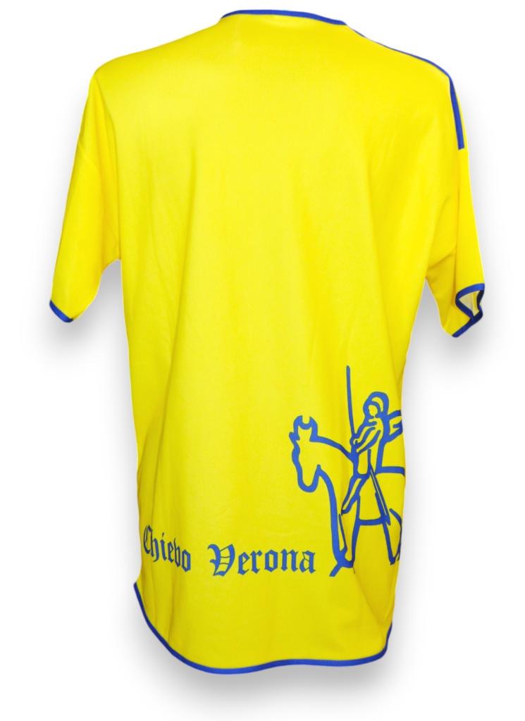 La divisa in versione home, riporta lo stemma del Chievo sul fianco raffigurante Cangrande I della Scala ed il nome della squadra in basso.