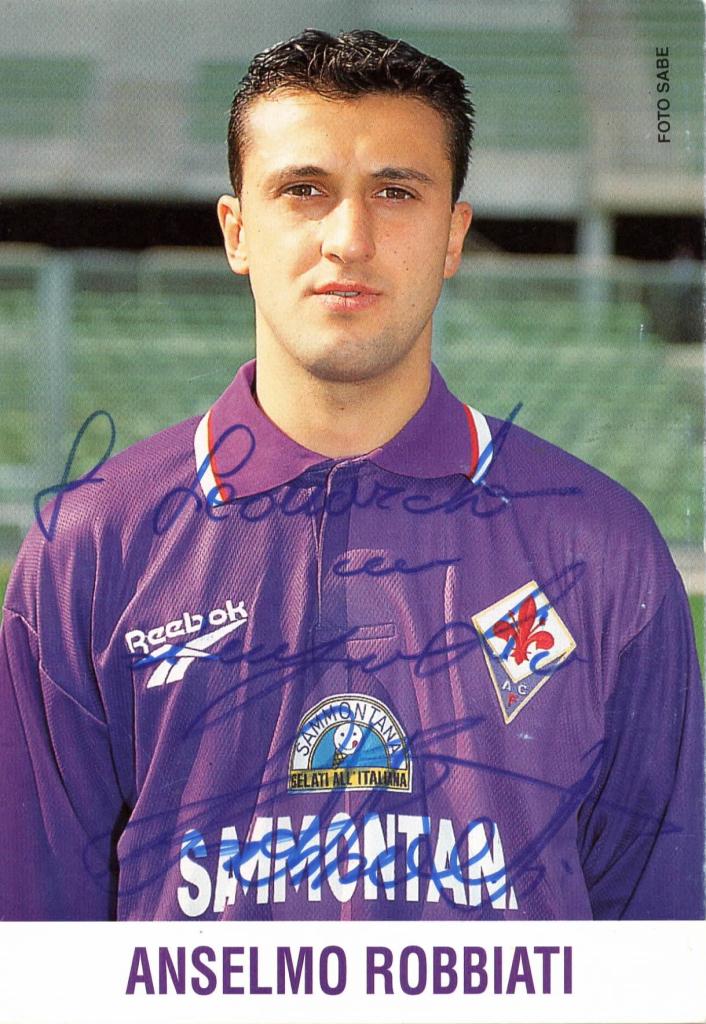 Cartolina pubblicitaria ACF Fiorentina con dedica interamente autografa e firmata del calciatore Anselmo Robbiati.