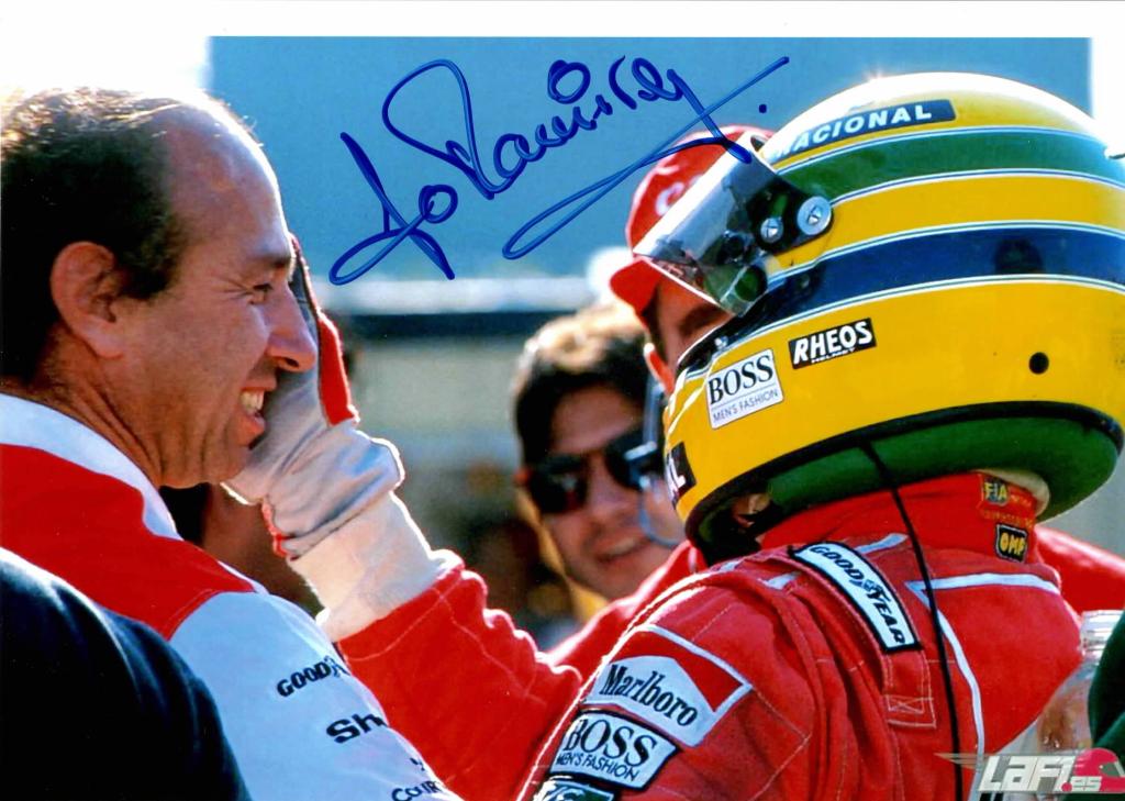 Nella fotografia il celebre dirigente si congratula con il pilota brasiliano Ayrton Senna.