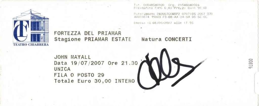Autografo di Mayall su biglietto del concerto tenutosi al Teatro Gabriello Chiabrera a Savona il 19/07/2007.