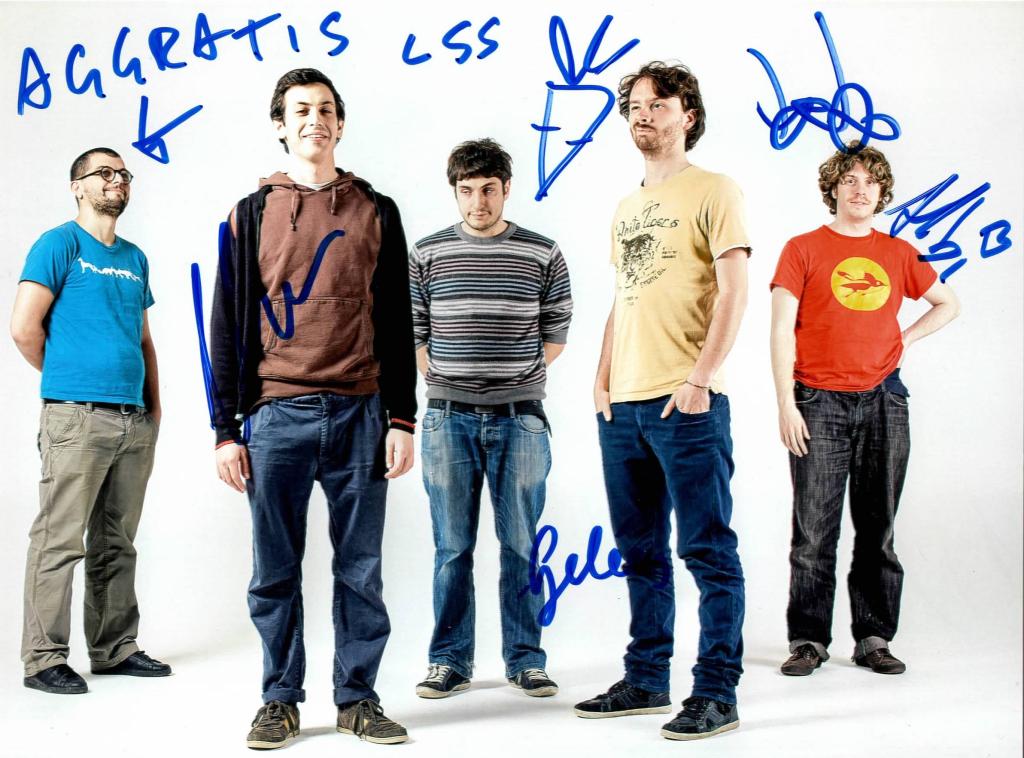 Fotografia a colori con firme autografe di tutti membri del gruppo musicale bolognese Lo Stato Sociale.