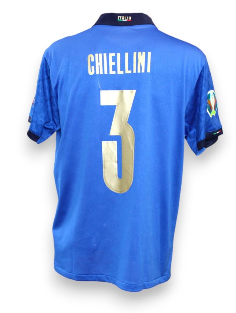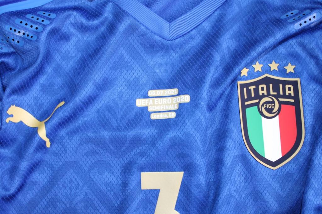 Maglia Italia versione Home Player Issued preparata per il calciatore Giorgio Chiellini per la semifinale Euro 2020 a Londra disputata contro la Spagna il 6-7-2021. L'Italia di Mancini e Vialli vinse Euro 2020.