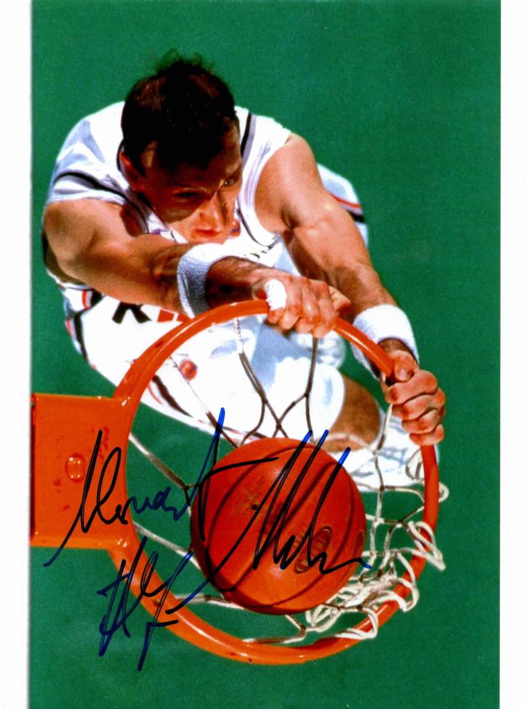 Fotografia che raffigura un canestro di Abbio, il cestista appone il suo autografo e il numero "7".