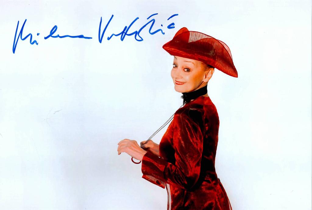 Autografo su fotografia di Milena Vukotic, attrice di teatro, cinema e televisione.