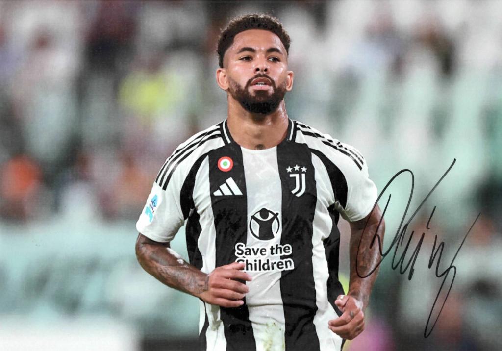 Fotografia con autografo del calciatore della Juventus e della nazionale Brasiliana Douglas Luiz con la maglia della Juventus per la stagione 2024-25 durante un match di Serie A.