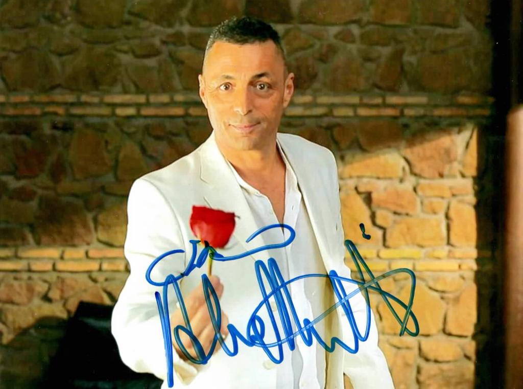 Autografo redatto su fotografia che ritrae Britti mentre è intento a porgere una rosa.