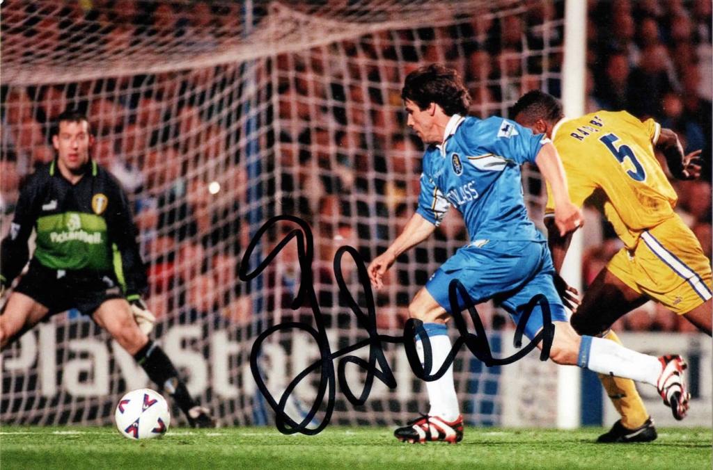 Fotografia con autografo di Gianfranco Zola che veste i panni del Chelsea Football Club davanti alla porta avversaria.