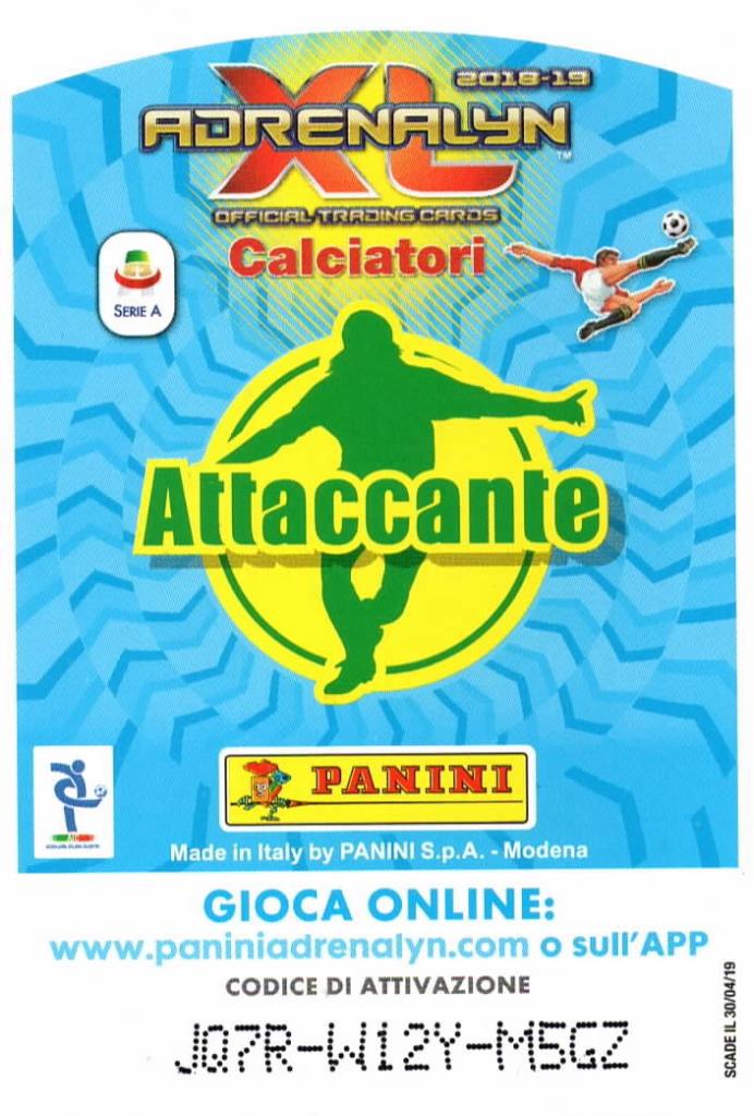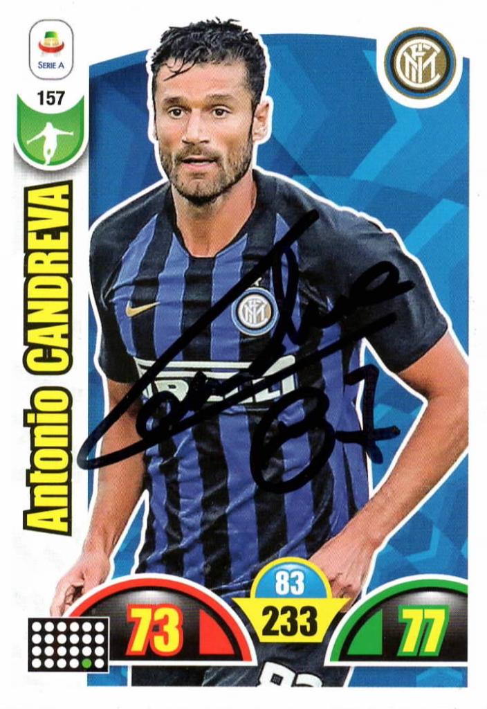 Autografo di Antonio Candreva redatto con pennarello nero a punta spessa su figurina Panini Adrenalyn che lo ritrae con la maglia dell'Inter nel campionato 2018-2019.