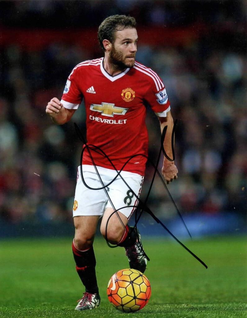 Autografo di Juan Mata, calciatore campione del mondo e d'Europa con la nazionale spagnola nel 2010 e 2012, redatta su fotografia della stagione 2014-2015 quando giocava con il Manchester United.
