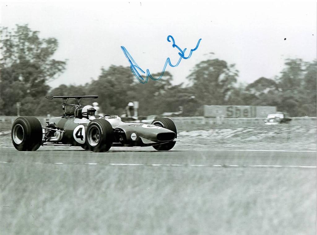 Fotografia in bianco e nero con firma autografa di Derek Bell, pilota automobilistico britannico.