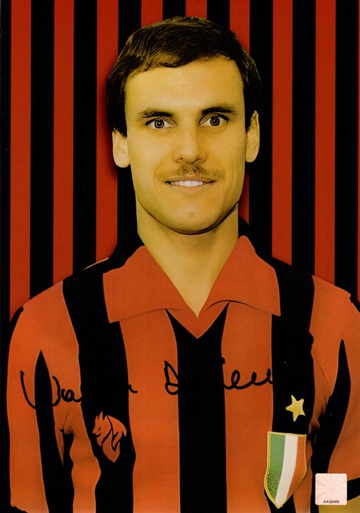 Autografo del campione italiano Walter De Vecchi, ritratto in una fotografia che lo raffigura nella stagione 1979-80, stagione che riportò lo scudetto tra le mani della squadra milanese e consegnò la stella (badge permanente che simboleggia la vittoria di dieci campionati Italiani).