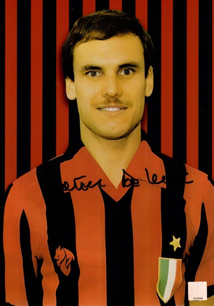 Autografo del campione italiano Walter De Vecchi, ritratto in una fotografia che lo raffigura nella stagione 1979-80, stagione che riportò lo scudetto tra le mani della squadra milanese e consegnò la stella (badge permanente che simboleggia la vittoria di dieci campionati Italiani).