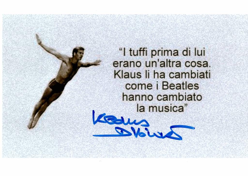 La fotografia ritrae Dibiasi durante un tuffo. È riportata una frase di Giorgio Cagnotto, suo amico e rivale, che recita " I tuffi prima di lui erano un'altra cosa. Klaus li ha cambiati come i Beatles hanno cambiato la musica".