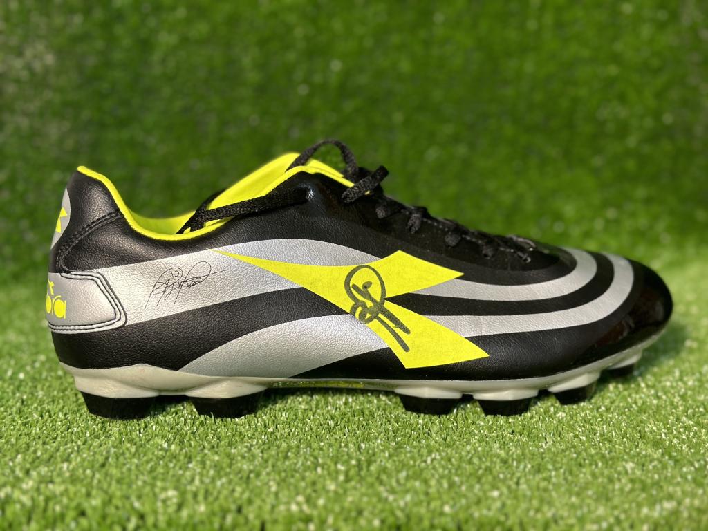 Scarpa Diadora taglia 45 con autografo di Roberto Baggio sul logo giallo.