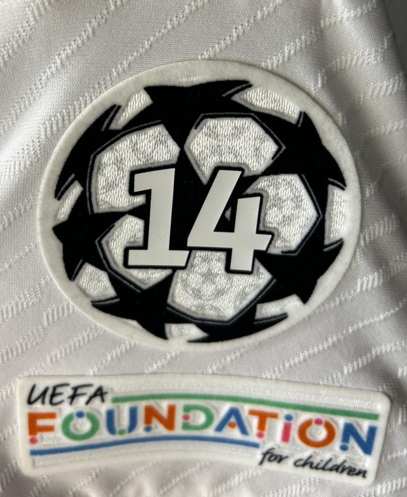 Sulle maniche la divisa riporta le patches della Uefa Champions League e Uefa Foundation for Children, oltre a quelli degli sponsor commerciali Emirates Fly Better; sul retro del colletto la scritta "!Hala Madrid!".