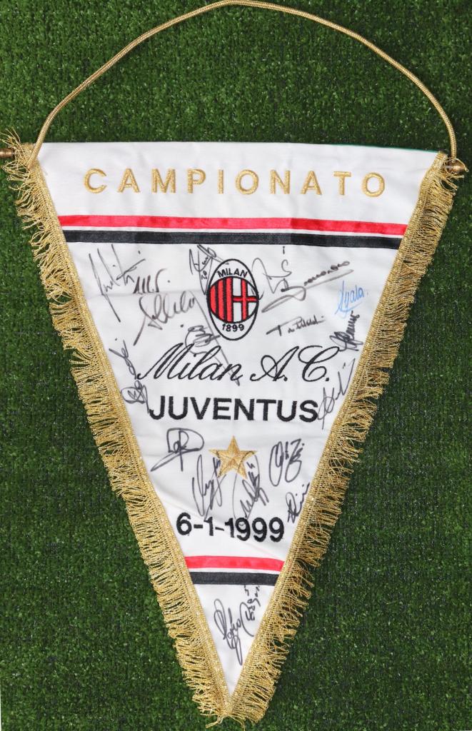 Sul gagliardetto sono presenti gli autografi di: Sebastiano Rossi, Christian Abbiati, Oliver Bierhoff, Zvonimir Boban, Christian Ziege, Bruno N'Gotty, Maurizio Ganz, Leonardo, Ayala, Ambrosini e Franco Baresi.