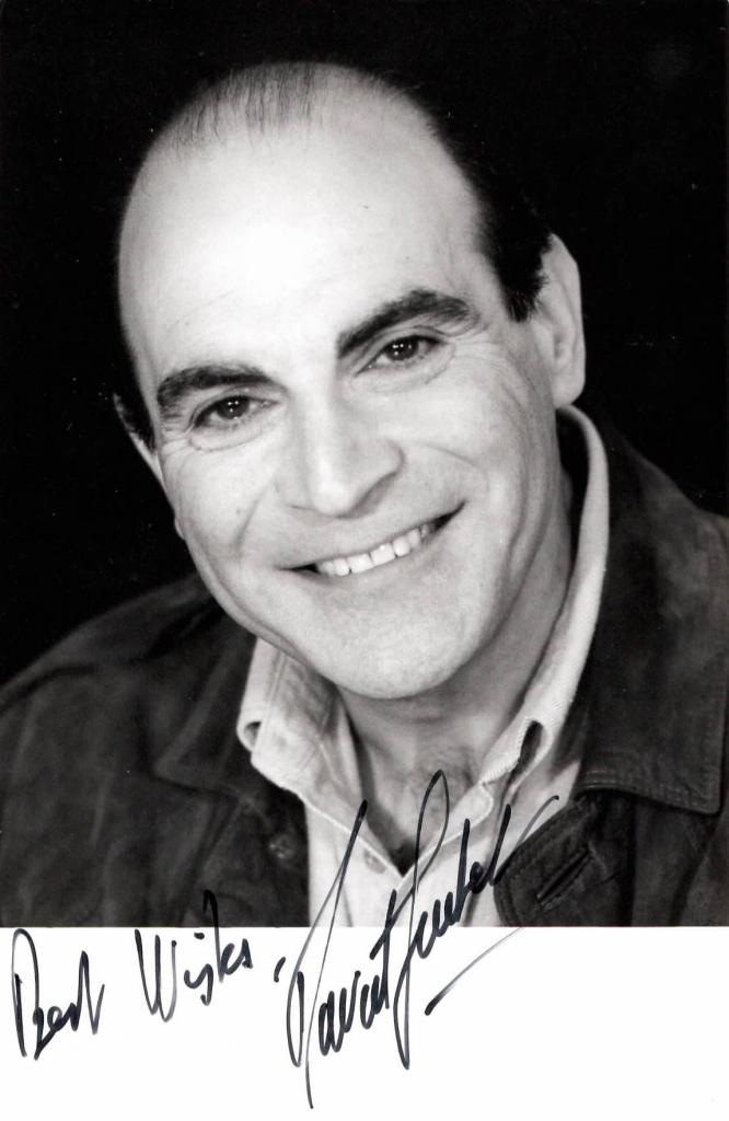 Bella fotografia che raffigura il primo piano di Suchet con una piccola dedica interamente autografa e firmata: "Best wishes".