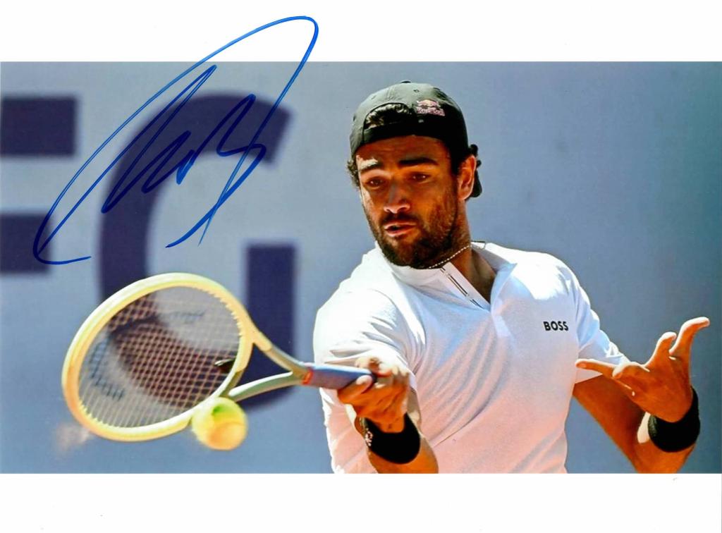 La fotografia ritrae Berrettini in azione sul campo. Bellissimo autografo redatto con pennarello blu di fianco alla sua figura.