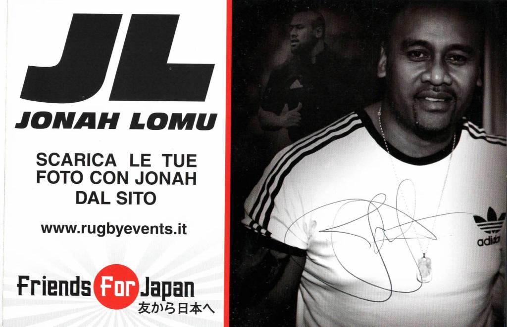 Cartolina promozionale di Friends for Japan con l'immagine e la firma autografa di Jonah Lomu.