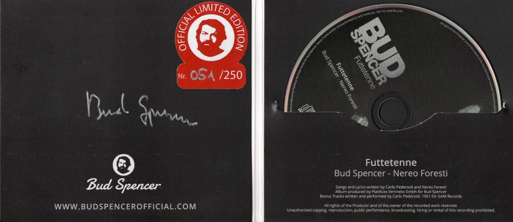 CD dal titolo: "Futtetenne" con l'adesivo "Official Limited Edition" nr. 051/250 e autografo di Bud Spencer redatto con pennarello argento.