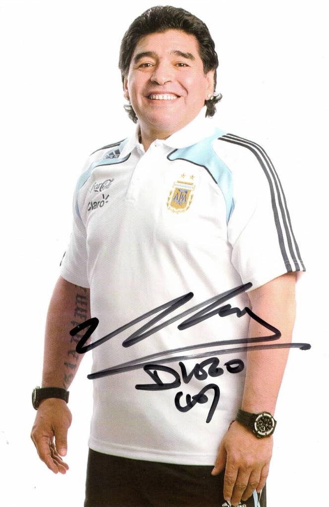 Autografo di Diego Armando Maradona celebre calciatore, allenatore di calcio e dirigente sportivo argentino di ruolo centrocampista offensivo, campione del mondo nel 1986 e vicecampione del mondo nel 1990 con la nazionale argentina.