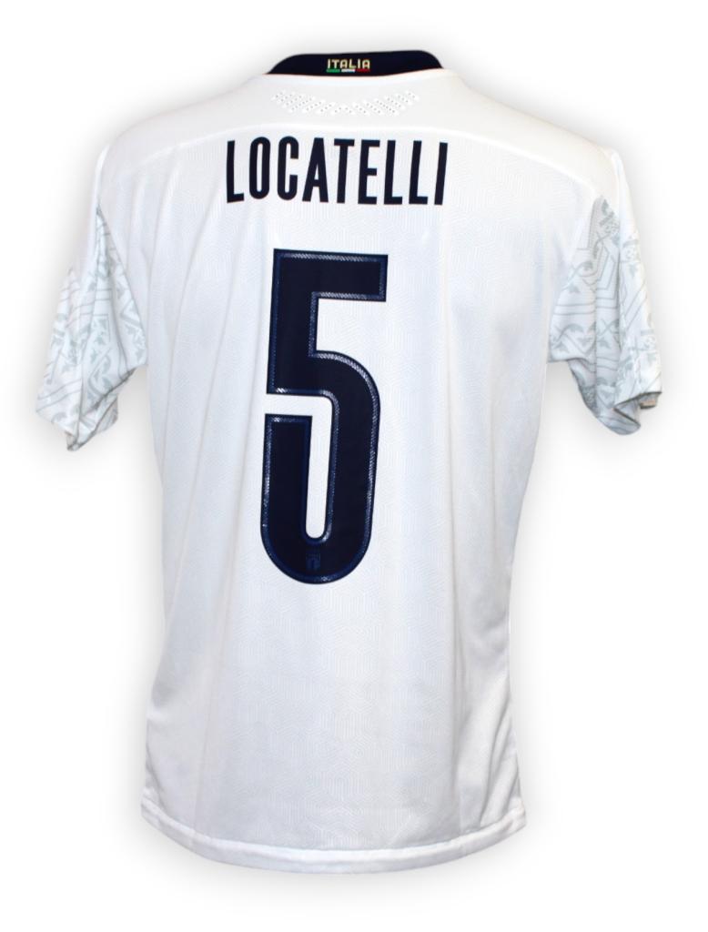 Maglia Italia versione Trasferta Player Issued preparata per il calciatore Manuel Locatelli per la Nations League a Sarajevo disputata contro la Bosnia il 18-11-2020, con matchday sul fronte.