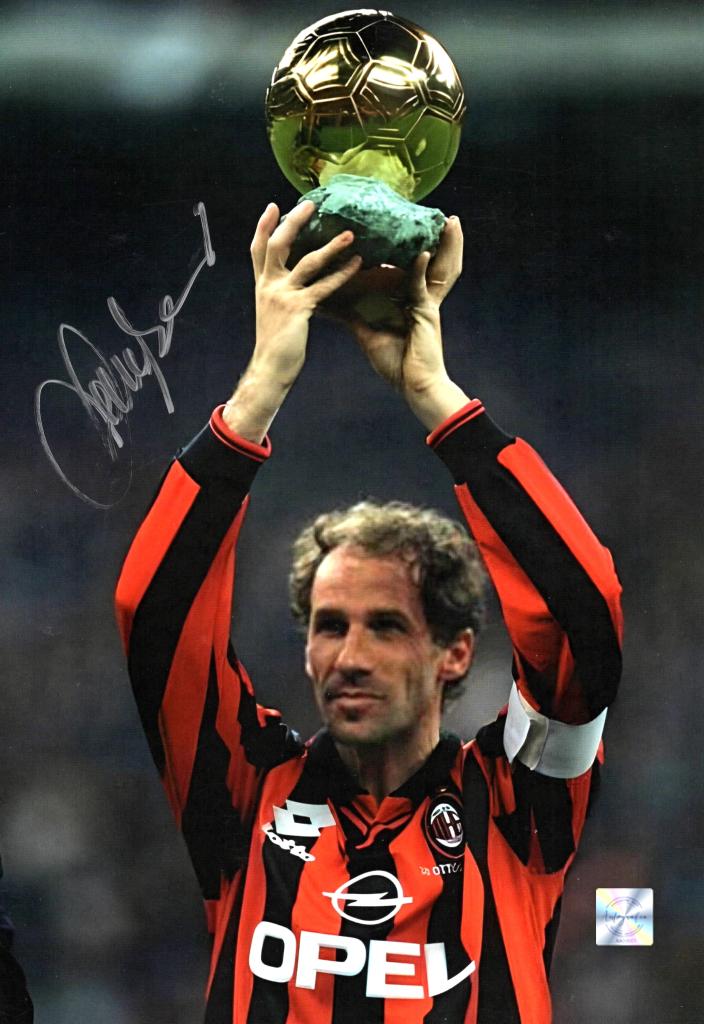 Fotografia con autografo del capitano del Milan e della Nazionale Italiana Franco Baresi, ritratto in occasione della consegna dello speciale pallone d'oro alla carriera, consegnatogli dal Presidente del Milan Silvio Berlusconi nella partita d'addio al calcio del 28 ottobre 1997.