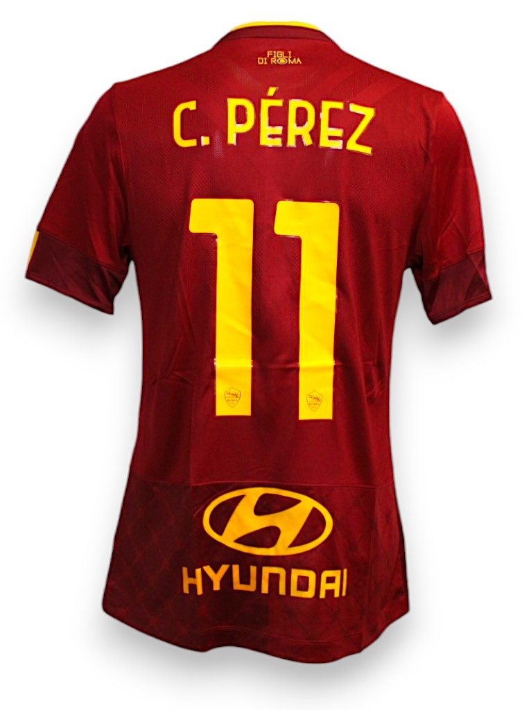 Maglia Store versione Home della Roma con il nameset del calciatore Carles Pérez della stagione 2022-2023.