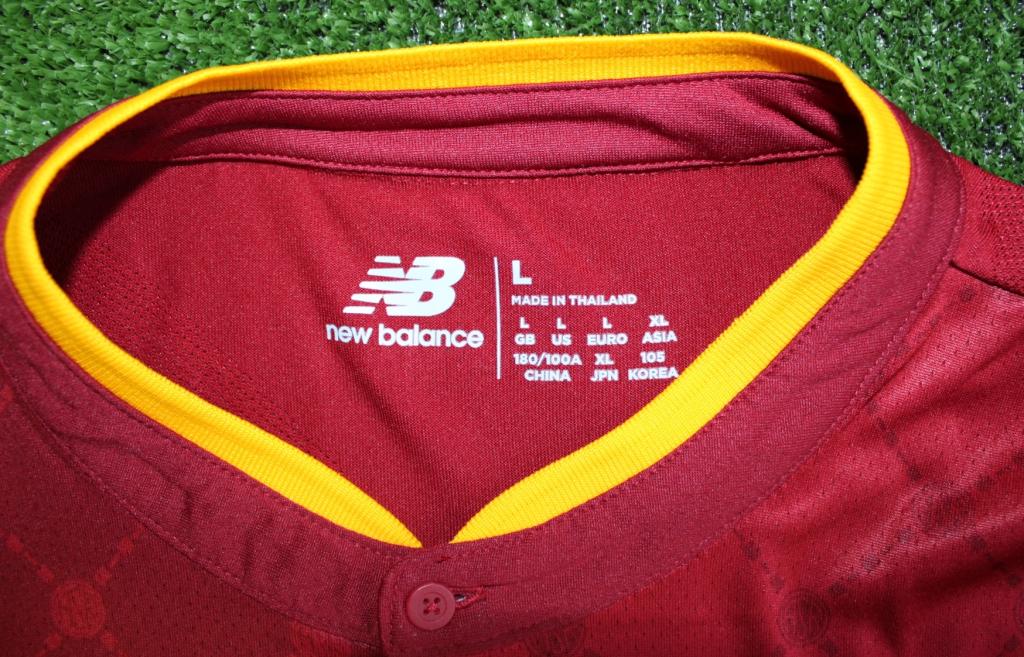 La maglia Home New Balance AS Roma 2022-23 presenta un sottile design a metà tra il rosso e il giallo.