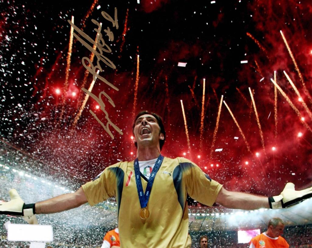 La fotografia, firmata in pennarello oro, mostra il portiere campione del mondo mentre esulta nello stadio di Berlino nel 2006.
