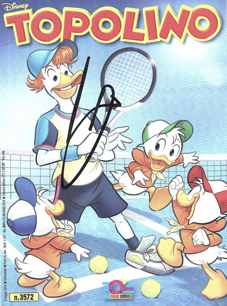 Topolino numero 3572 con autografo di Jannik Sinner celebre tennista italiano. Con la nazionale italiana ha conquistato la Coppa Davis nel 2023 e nel 2024.