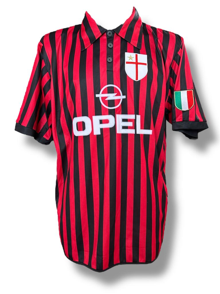 Maglia del Milan della stagione 1999-2000, realizzata per celebrare il centenario del club. Si tratta di una replica originale prodotta dal Milan. Il design classico a strisce verticali rossonere è completato dallo stemma del club con la croce di San Giorgio e stella dorata, oltre allo sponsor Opel applicato in flock.