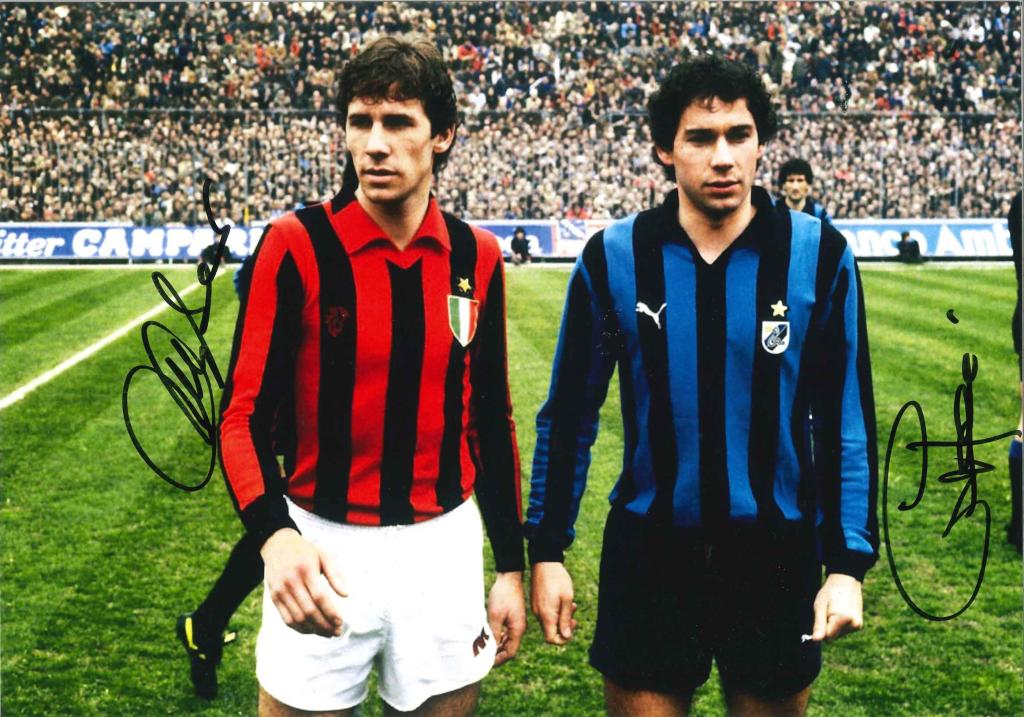 Fotografia con autografi di Franco Baresi e Giuseppe "Beppe" Baresi, due leggende del calcio italiano, durante un Derby della Madonnina tra Milan e Inter, disputato allo Stadio San Siro di Milano.