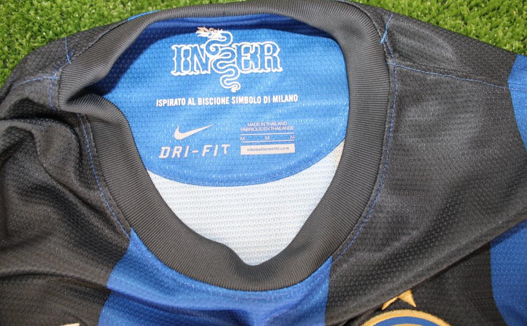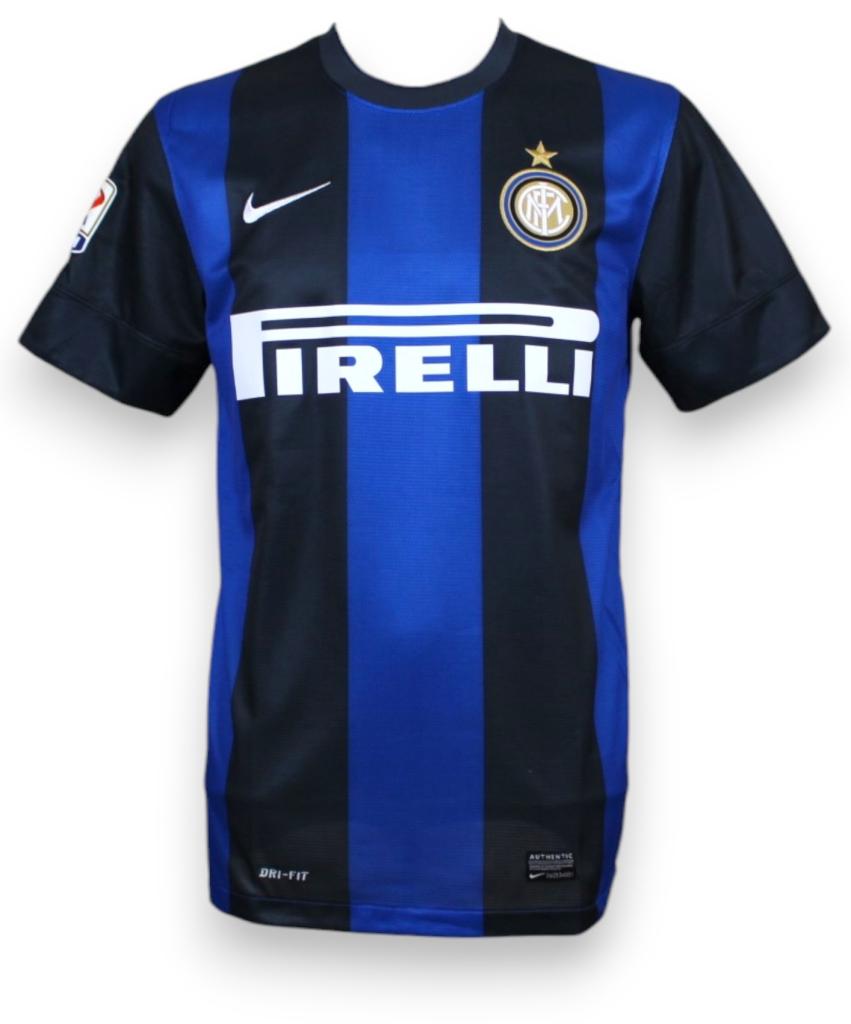 Maglia dell’Inter 2012-13 autografata da Javier Zanetti. Si tratta di una versione store prodotta da Nike, realizzata in Thailandia, con tecnologia Dri-Fit. Il design presenta le classiche strisce verticali nerazzurre, con colletto nero e sponsor tecnico Nike ricamato sul petto, opposto allo stemma dell’Inter con stella dorata. Sponsor Pirelli in bianco.