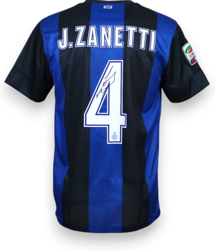 Sulla manica destra è applicata la patch della Serie A TIM. Il retro riporta il nome “J. ZANETTI” e il numero 4 con font ufficiale della stagione, e riporta l’autografo originale del capitano argentino, leggibile e firmato con pennarello nero.