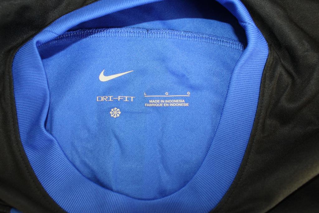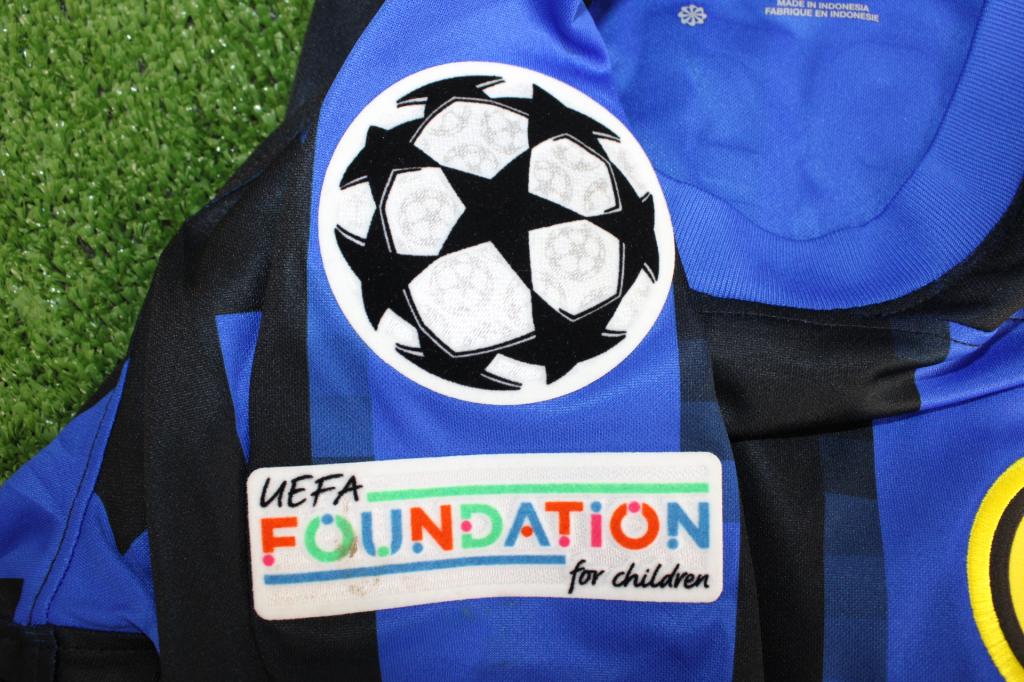 Presenta stemma societario gommato, swoosh giallo, sponsor Paramount+ e coccarda Coppa Italia. Patch UCL e UEFA Foundation applicate sulle maniche. Sul retro nome e numero di Nicolò Barella, con firma autografa.