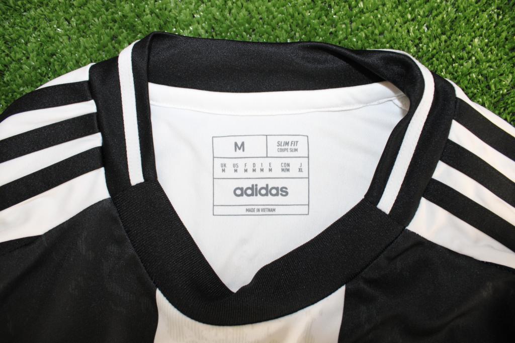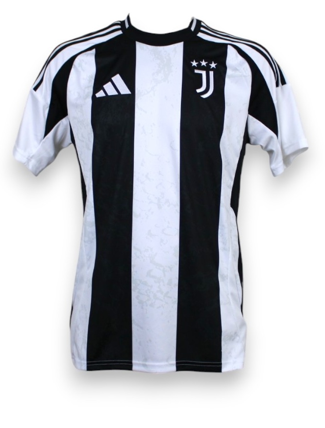 Design classico a strisce verticali bianconere con texture marmorizzata tono su tono, logo Adidas e stemma del club con tre stelle termosaldati sul petto.