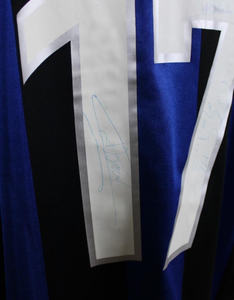 Il logo Nike giallo e lo stemma societario sono cuciti. La maglia, realizzata in UK, dettaglio tipico delle versioni player issued Nike di fine anni ’90, presenta sul retro il nome Domoraud e il numero 17, con autografo originale del calciatore.