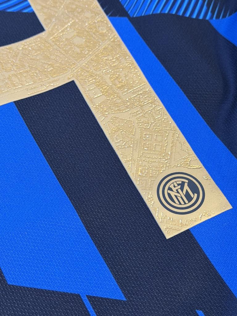 Realizzata da Nike nella versione Home, presenta un design moderno che reinterpreta le classiche strisce nerazzurre con inserti geometrici e dettagli dorati. Sul petto sono applicati il logo Nike, lo stemma dell’Inter con stella celebrativa e lo sponsor commerciale Pirelli in color oro.